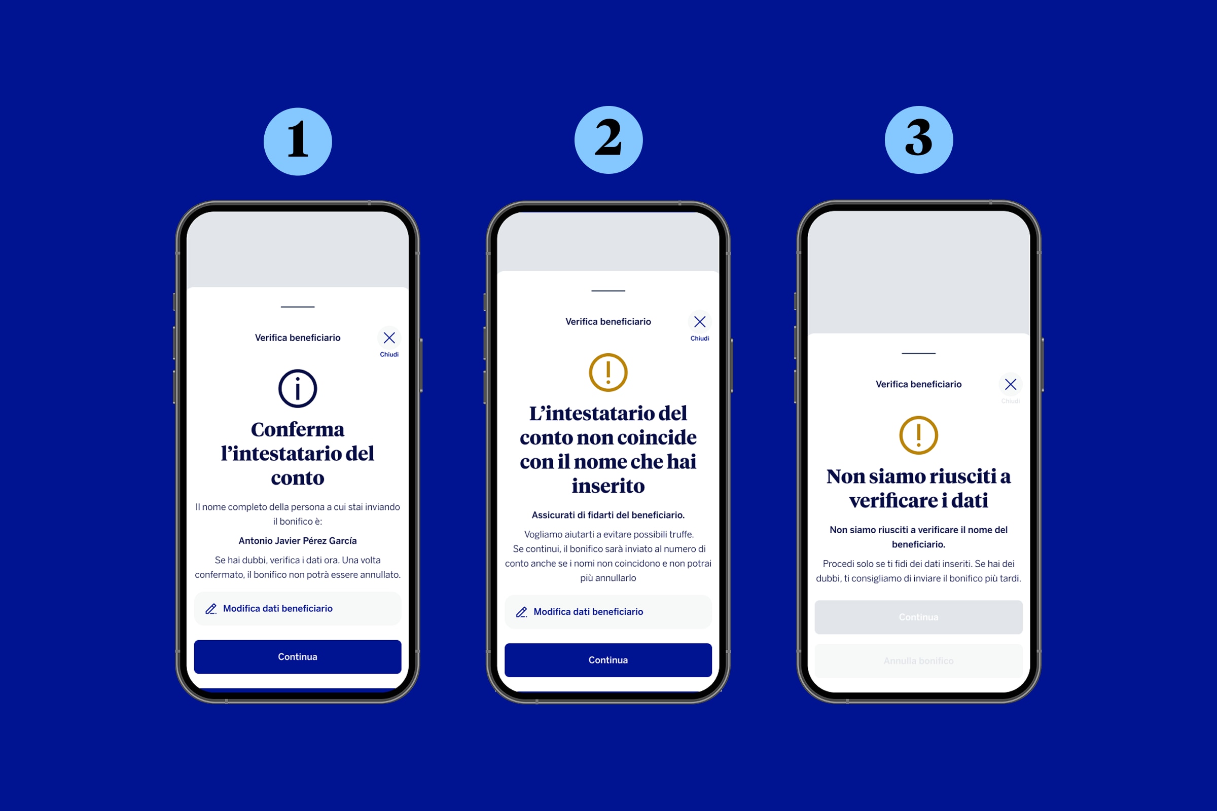 Prima di eseguire un bonifico controlleremo se il destinatario indicato dal cliente e il titolare del conto beneficiario del bonifico corrispondono. In caso non fosse così, anche solo in parte, riceverai un avviso di verifica. Ecco i casi possibili: