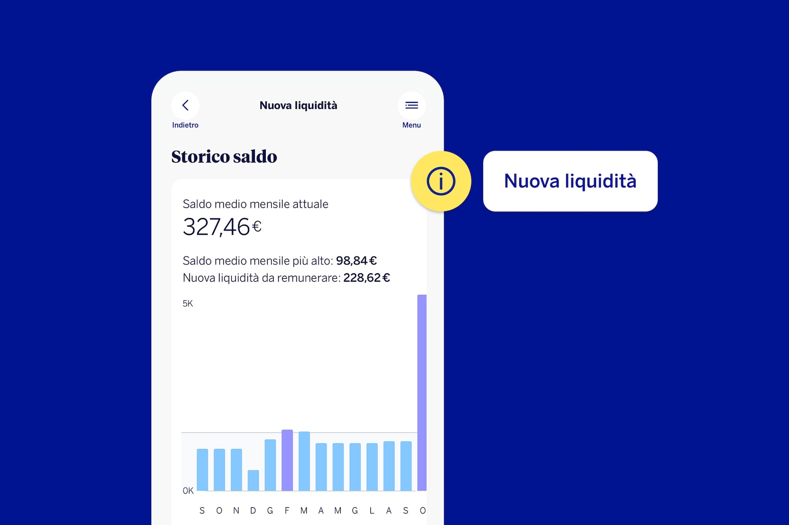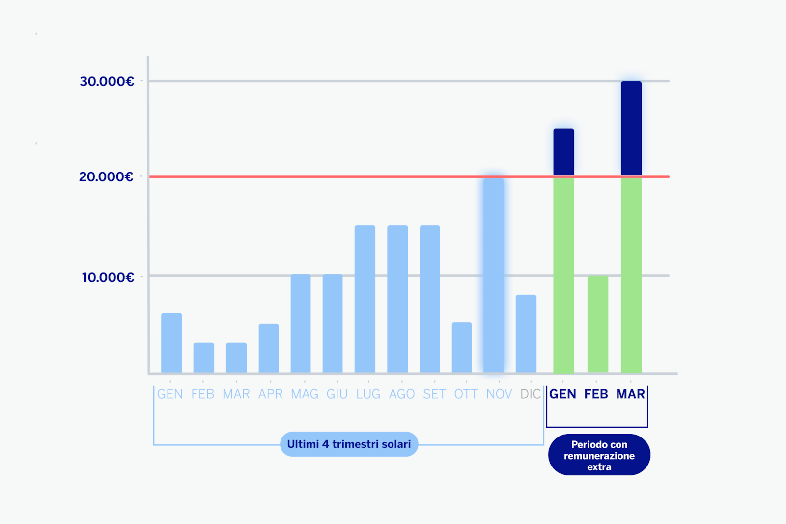 Immagina che il saldo medio massimo registrato nei quattro trimestri precedenti sia di 20.000€ (novembre). Ogni mese si confronta il saldo medio mensile con questo valore per calcolare la Nuova Liquidità. In questo esempio consideriamo che tu abbia la domiciliazione dello stipendio attiva sul conto.